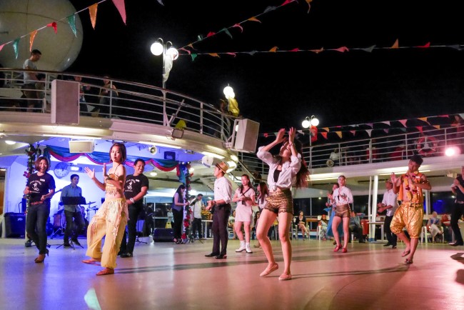 晚上虽然累但最后一晚怎能早早去睡觉?笔者又和同伴到甲板上参与超级天秤星号告别欢送派对,观赏船员们的精炼舞蹈表演以及乐队表演唱,一直到大家都离开了我们才跟着回到房里休息。