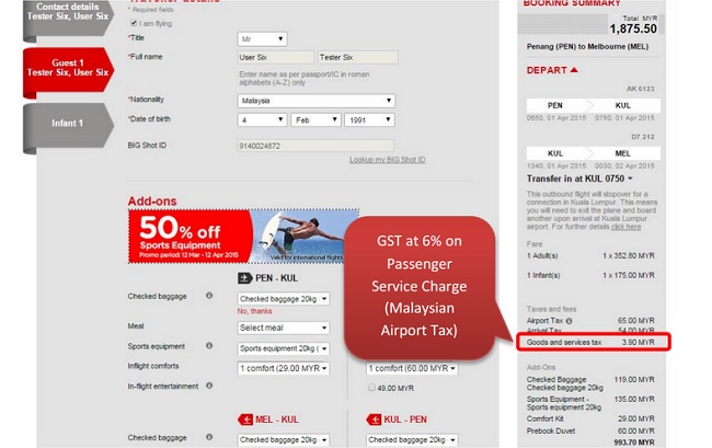 总而言之,凡是在马来西亚境内机场出发或抵达的航班都会被征收机场税及该费用的6%消费税。额外添加服务(如:托运行李、飞机餐等)是否会被征收消费税就视该航班是本地航班还是国际航班而定,只有马来西亚飞马来西亚的航班才会被征收额外添加服务的消费税,国际航班的额外添加服务是免消费税的。