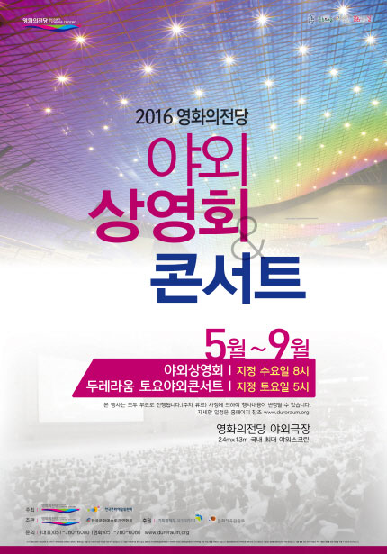2016 年 5 月至 9 月期间,釜山电影中心(Busan Cinema Center)将于每逢星期三开放给民众免费观赏户外电影!活动期间每个月都有一个电影主题,每逢星期三晚上八点将免费放映该月份的主题影片,比如五月“家庭”、六月“香港英雄”、七月“黄金岁月”、八月“幻想”以及九月“电影及表演”。