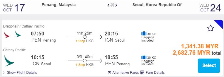 Penang飞首尔,只需RM1,341.38(一人)
