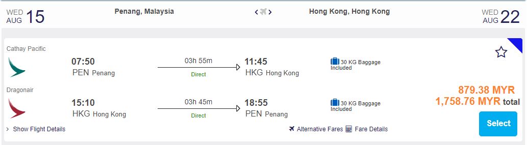 Penang飞香港,只需RM879.38(一人)