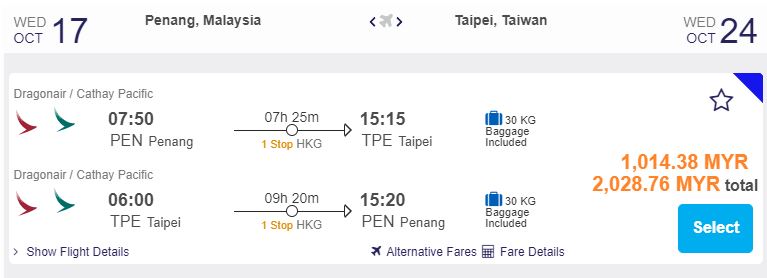 Penang飞台北,只需RM1,014.38(一人)