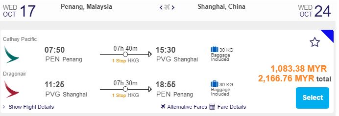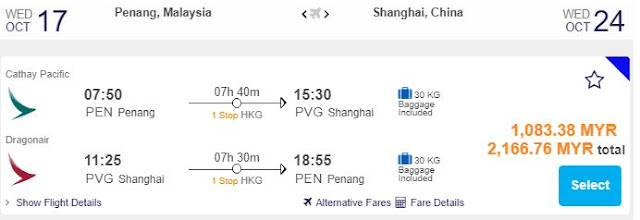 Penang飞上海,只需RM1,083.38(一人)
