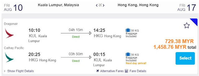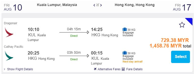 KL飞香港,只需RM729.38(一人)