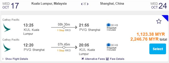 KL飞上海,只需RM1,123.38(一人)