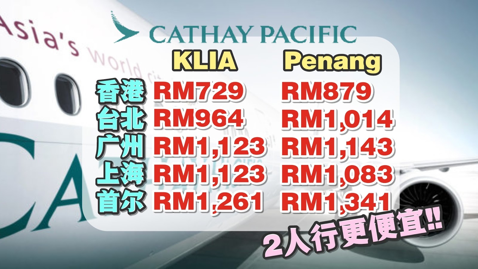 只需2人同行,谁都能以优惠价乘搭Cathay Pacific飞往香港!!