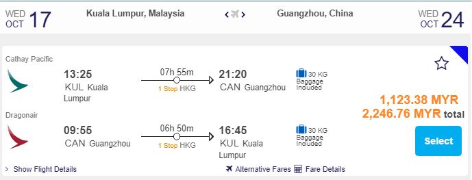 KL飞广州,只需RM1,123.38(一人)