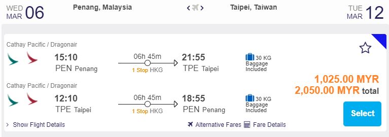台北Taipei:RM1,025 (官网原价RM1,072)