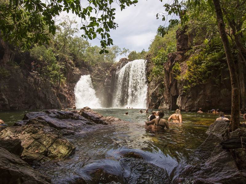由达尔文市出发,开车约2小时就会抵达李治菲特国家公园,那是一个经常年风化而成的沙岩悬崖区,因为所处的位置地下泉水充沛,加上季风雨的帮助,形成大大小小的瀑布区,其中最著名的包括Florence瀑布、Tolmer瀑布、Wangi瀑布等,可驻足观看瀑布由悬崖绝壁飞奔而下的壮景,或在绿树环绕的水潭中畅游,感受清凉。公园入口处可见构造精巧的白蚁丘,数百万的白蚁军团沿着南北轴线建造这些白蚁王国,许多白蚁丘的高度甚至超出2米,叫人惊叹!