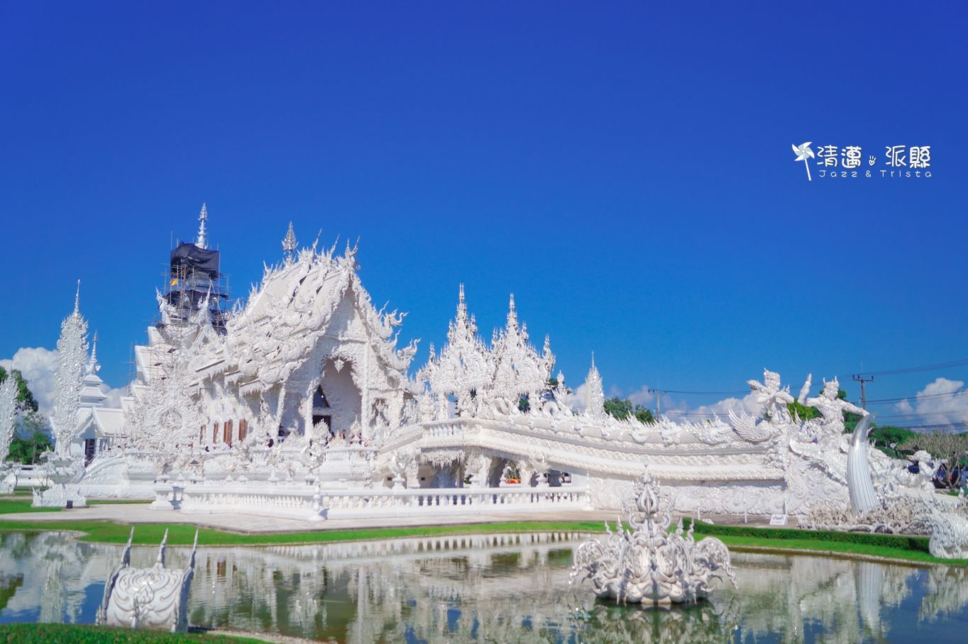 不同于泰国传统金碧辉煌的寺庙,白庙以纯白为底,镜面玻璃镶边,洁白无瑕,却在阳光照射下反射出灿烂夺目的光芒