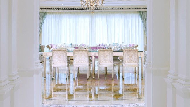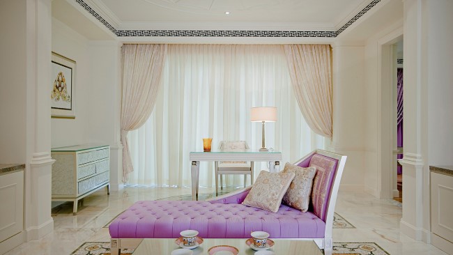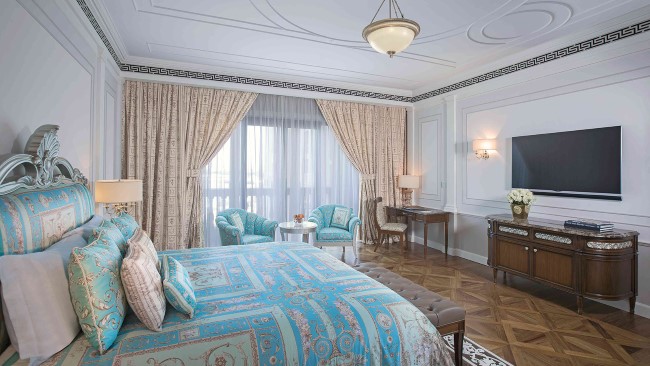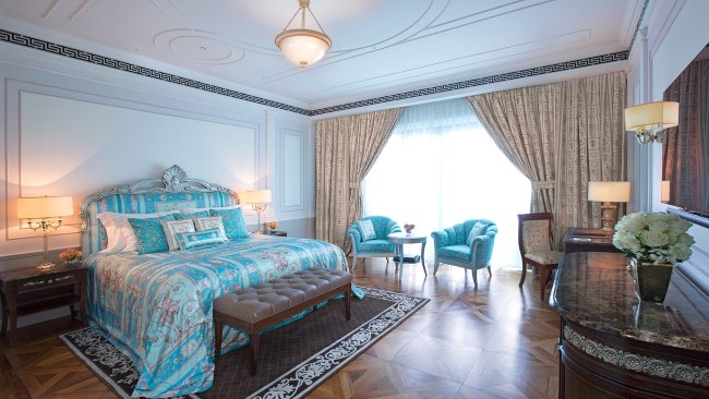 这座皇宫般的酒店耗资 23 亿迪拉姆,共有 300 多间房。房内完全采用 Versace 特色家具,并设有 Swarovski 水晶墙壁、闪烁黑石英地板等尽显奢华特色的装横。这栋外型壮观的酒店位于海滨位置,除了奢华的客房也拥有先进的健身房、水疗中心、游泳池以及华丽的会议室和大会堂。