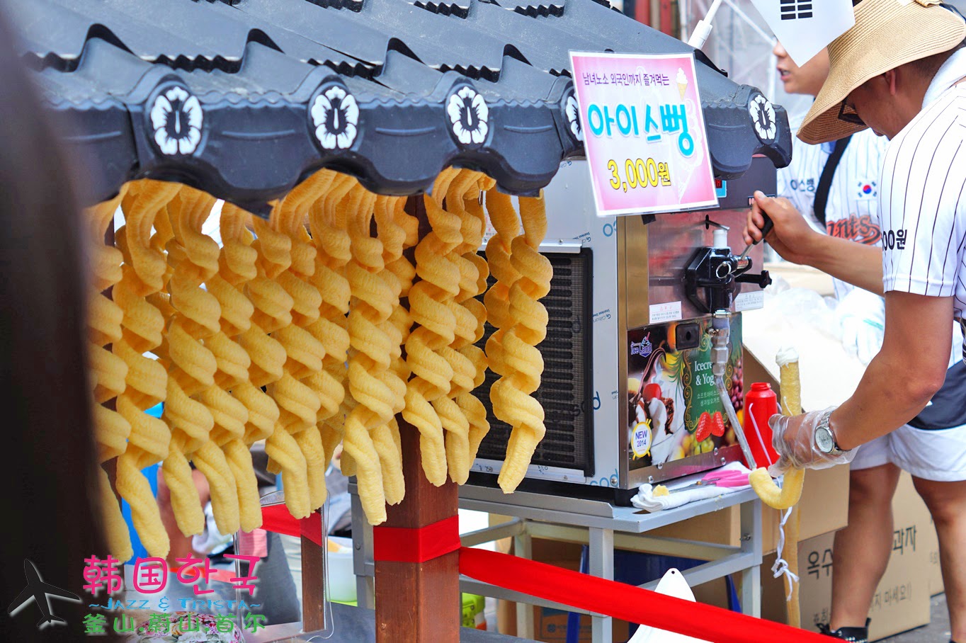 吃了瓜子黑糖饼,走上前不久可以到处看到很多档口都在卖这个J型的玉米饼雪糕