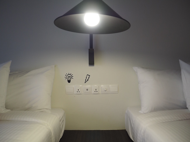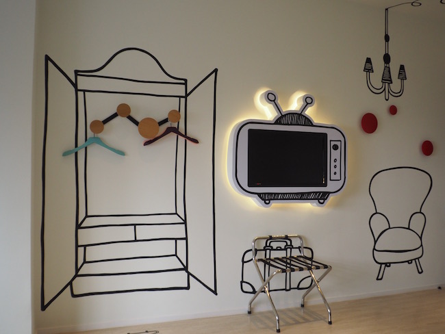 房间的设计装横非常俏皮可爱,墙壁上有手绘的图案,代表着各个物品的功能。比如衣架就在衣橱上,行李可以放在行李架上,电视就是真正的电视(有不少频道可以观赏)!