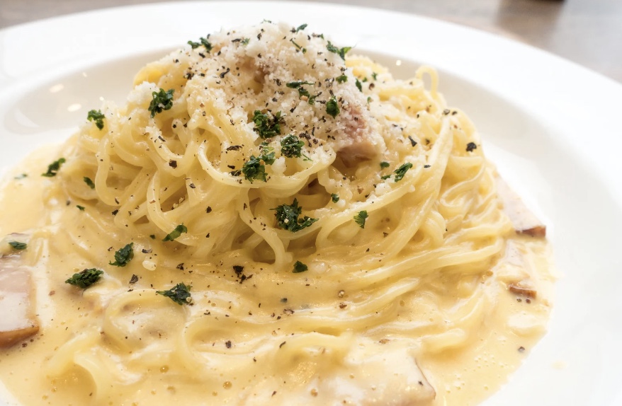 没有一滴奶油,全靠蛋液与起司融合出的浓郁酱汁,滑顺香浓,咸香十足。