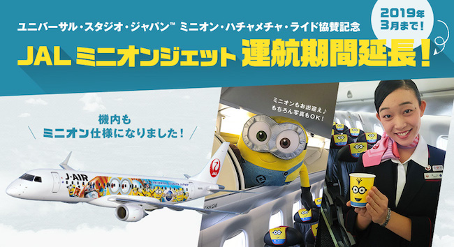 日本航空(Japan Airlines,简称 JAL)与日本环球影城合作,于 2017 年 7 月 27 日推介 Minion Jet 航班,印上小黄人开心面孔的 Minion Jet 只限于国内航线飞。年末更推出了机内的 Minion 限定服务,让您在飞机上也能感受小黄人的欢乐!