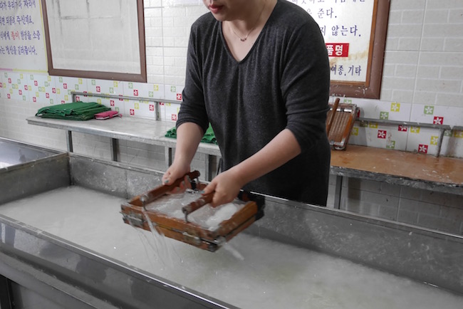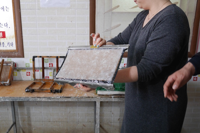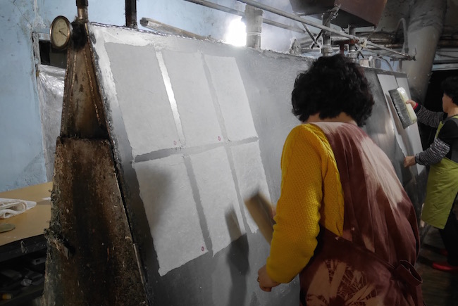工厂内的巨型烫板。每一张纸都是大婶们贴上超热的烫板上烫干成纸的。亲手做好的韩纸可以带回家做纪念。