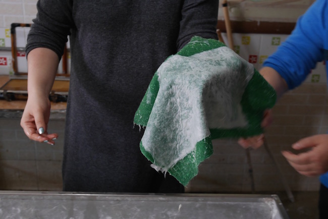 取出来的一片纸浆基本上已经成型,只需要烫干就会变成一张纸了。