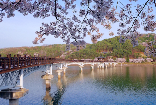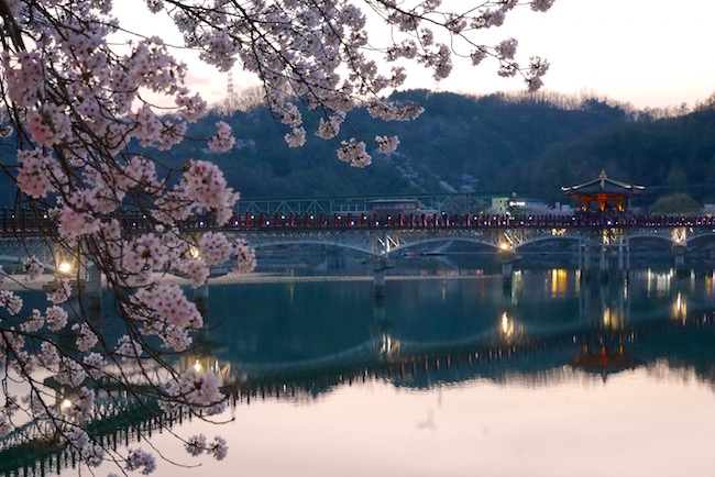 位于安东的月映桥因是韩国最长的木桥(全长 387 公尺)而闻名,这条桥装上了喷泉及幻灯,入夜时分亮灯时非常漂亮,而喷水表演也吸引许多游客前往观赏。但您也许不知道,这条桥的两岸其实种满了樱花树,春天樱花盛开时格外美丽,配合黄昏美景格式浪漫。月映桥附近的商店区有好几家咖啡馆,不妨在黄昏前抵达,买一杯饮料在慢慢在这一区散步欣赏日落美景。