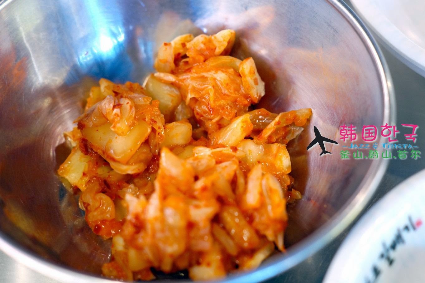 那个会说中文的大妈似乎看透我们的疑问,她说这是待会加入泡菜蛋内的,没得再续的