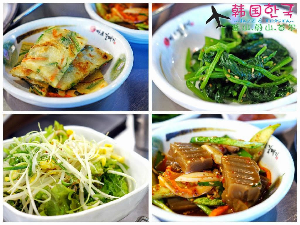 有韩式葱煎饼、炒空心菜、沙拉还有橡子糕