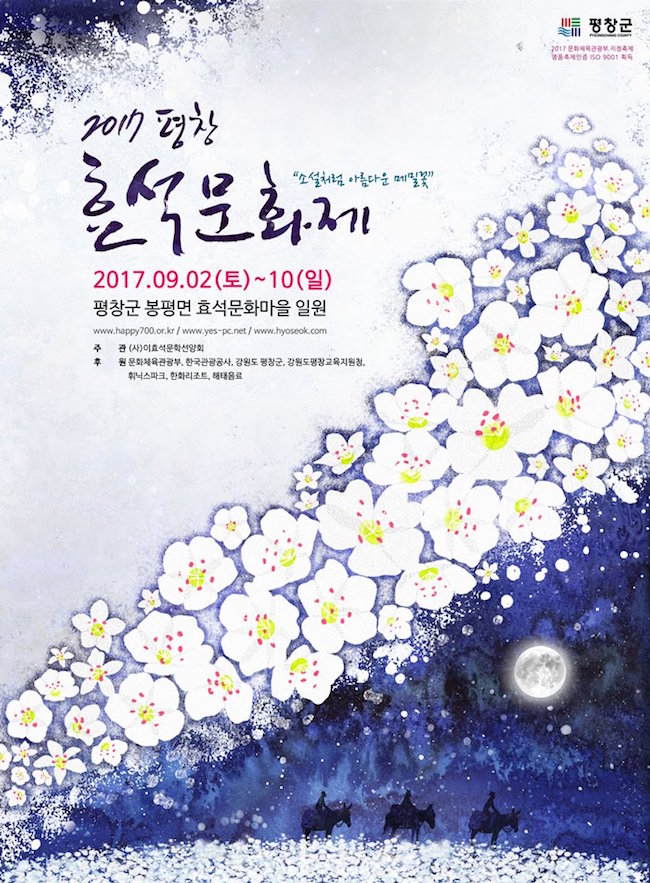 每年八月底至九月初荞麦花开的时候,江原道平昌郡蓬坪面一带就会举行孝石文化节,而 2017 年的平昌孝石文化节则定于 9 月 2 至 10 日举行。在冬季来临、平昌迎接 2018 年冬季奥运会的到来前,先到平昌欣赏小说中描绘的美丽荞麦花和风景,并参与文化节期间丰富的民俗、文化、演出和美食体验活动吧!