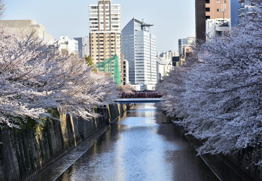 目黑川:河道两侧樱花形成粉色隧道,是社交媒体上最常见的画面之一。