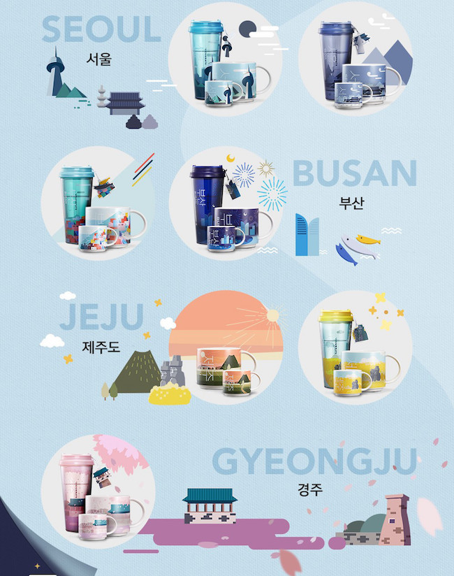 除了首尔、釜山、济州岛及庆州这几个游客喜爱的城市,韩国其他主要城市如仁川、大邱、光州等等也有推出城市系列产品,每款设计都纳入了该市的特色,非常有纪念价值呢!(照片来源:韩国星巴克)