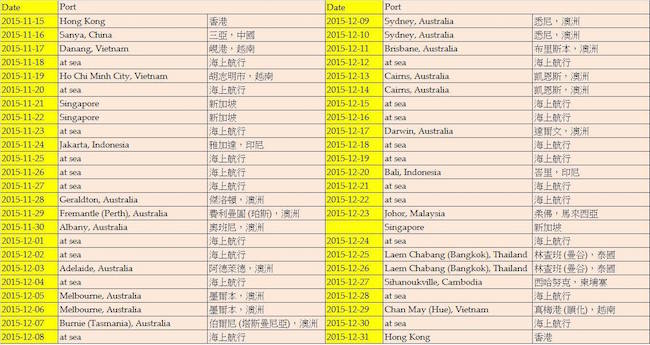 处女星号的南半球形成,初步定于 11 月 15 日从香港出发,12 月 31 日回到香港。当中在新加坡、墨尔本、悉尼、凯恩斯、曼谷都回国也停留,更会在曼谷过圣诞节。全程有不少港口都是处女星号或丽星邮轮首次到访。客人可惜选择乘搭全程,或各款不同天数的分段。