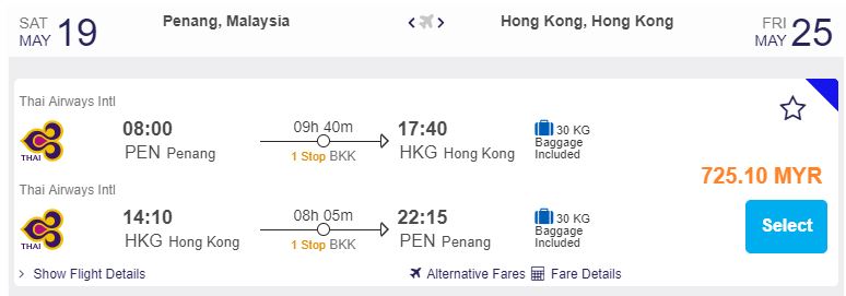 Penang飞往香港,只需RM725.10