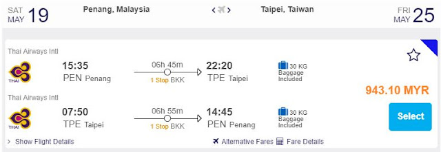 Penang飞往台北,只需RM943.10