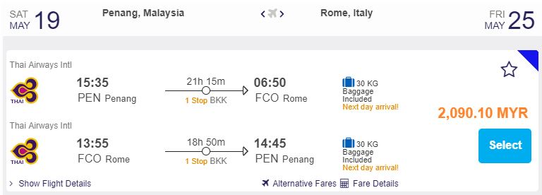 Penang飞往Rome,只需RM2,090.10