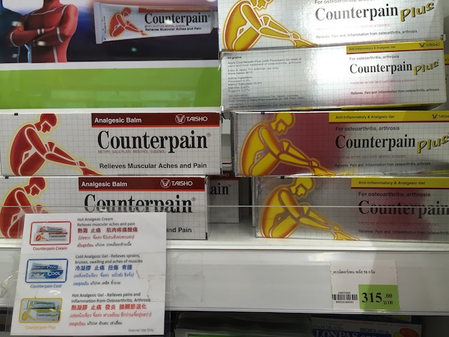 这是非常有名的舒缓肌肉疼痛膏,在泰国的西药房可以看到有许多不一样颜色包装的,红色的事最普遍的白色热膏,蓝色的是冷凝胶,而最新推出金色的是热凝胶。