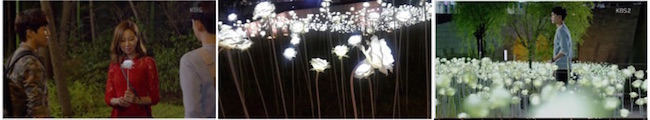 白承灿送卓艺珍LED玫瑰的场面是在东大门DDP拍摄的。DDP内设有艺术厅、展览馆、设计实验室、创意市场和东大门历史文化公园五个区域,LED玫瑰展示就在这里举行,2万多玫瑰,夜间点亮后如同星海一样,亮灯时间是日落后至晚上10点(韩国时间),展览一直持续到2016年2月。