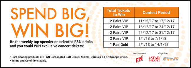 2017 年 12 月 11 日至 2018 年 1 月 14 日之间通过 11street 购买 F&N 产品,消费额最高的消费者即可赢取 VIP 或 Gold 级别的《学友-经典》演唱会票。