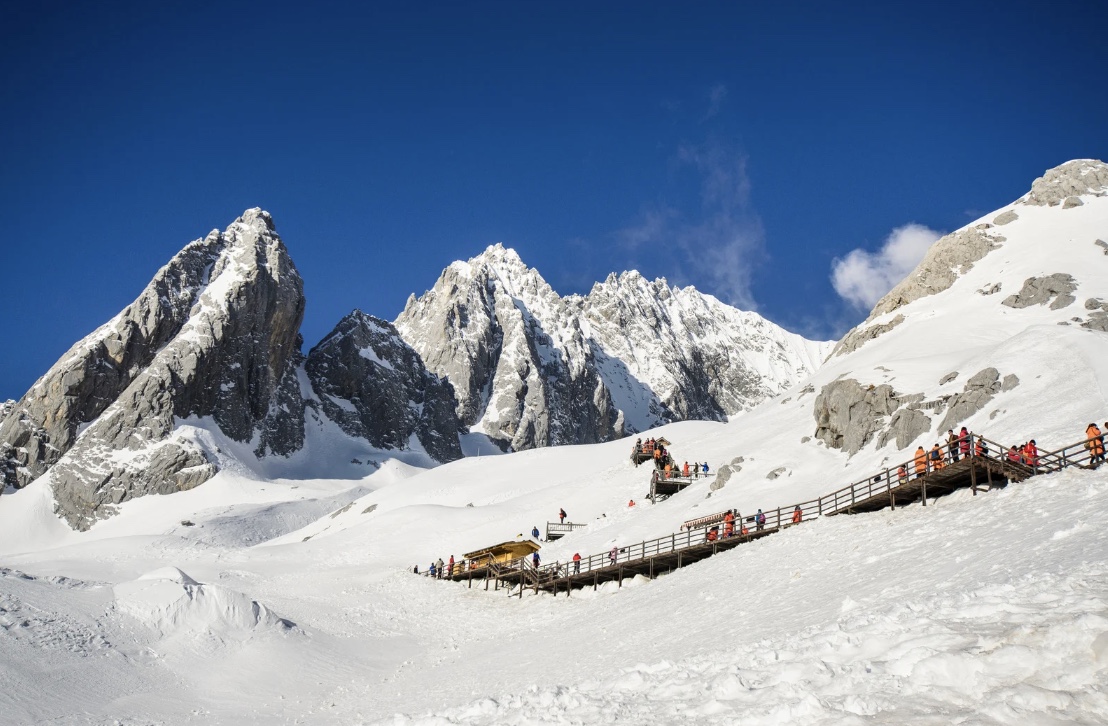 玉龙雪山:海拔5596米的神山,乘索道直达冰川公园,雪景壮丽。