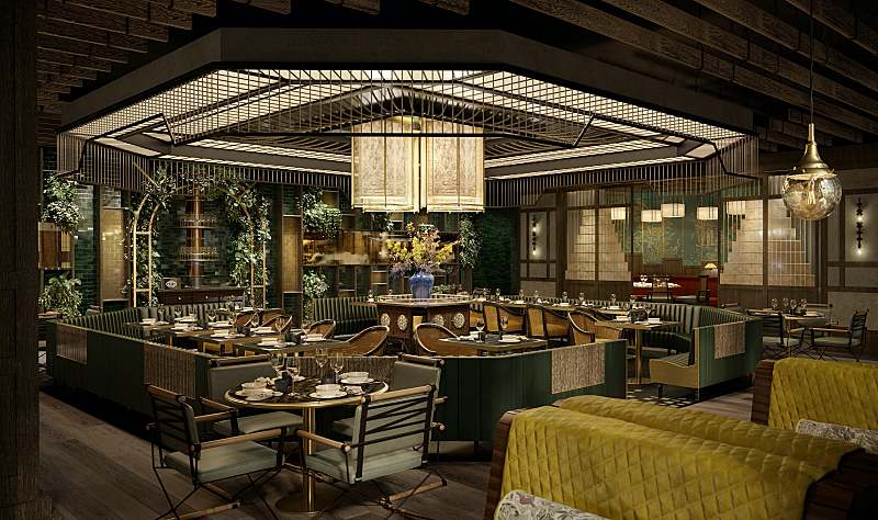 Over at the main dining room, a decorative canopy reminiscent of pagodas makes a compelling centerpiece with its jade tone – again, heralding its Chinese-inspired design. Soft furnishings bring the dining space alive with pale mint sofas, with Mott 32’s classic bucket chairs filling the space under the impressive canopy.