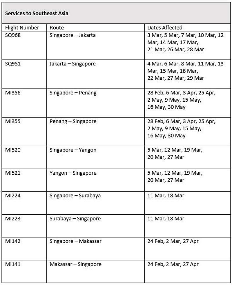 Singapore Airlines and SilkAir will temporarily reduce services across our network due to weak demand as a result of the Covid-19 outbreak. Details of the affected flights can be found in the tables below. We will continue to monitor the situation and make further adjustments as necessary. Affected customers will be notified and re-accommodated onto other flights. If you have booked your tickets through a travel agency, please contact your agent for assistance. If you have booked your tickets directly with Singapore Airlines, please contact the SIA reservations team at (+65) 6223-8888 if you need any assistance.As we are expecting large volumes of calls, we seek your patience and understanding that our customer service agents may take longer than usual to respond to you. Singapore Airlines and SilkAir apologise for the inconvenience caused. First posted on 18 February 2020, 0908hrs (GMT +8)